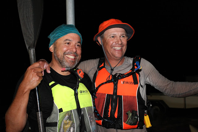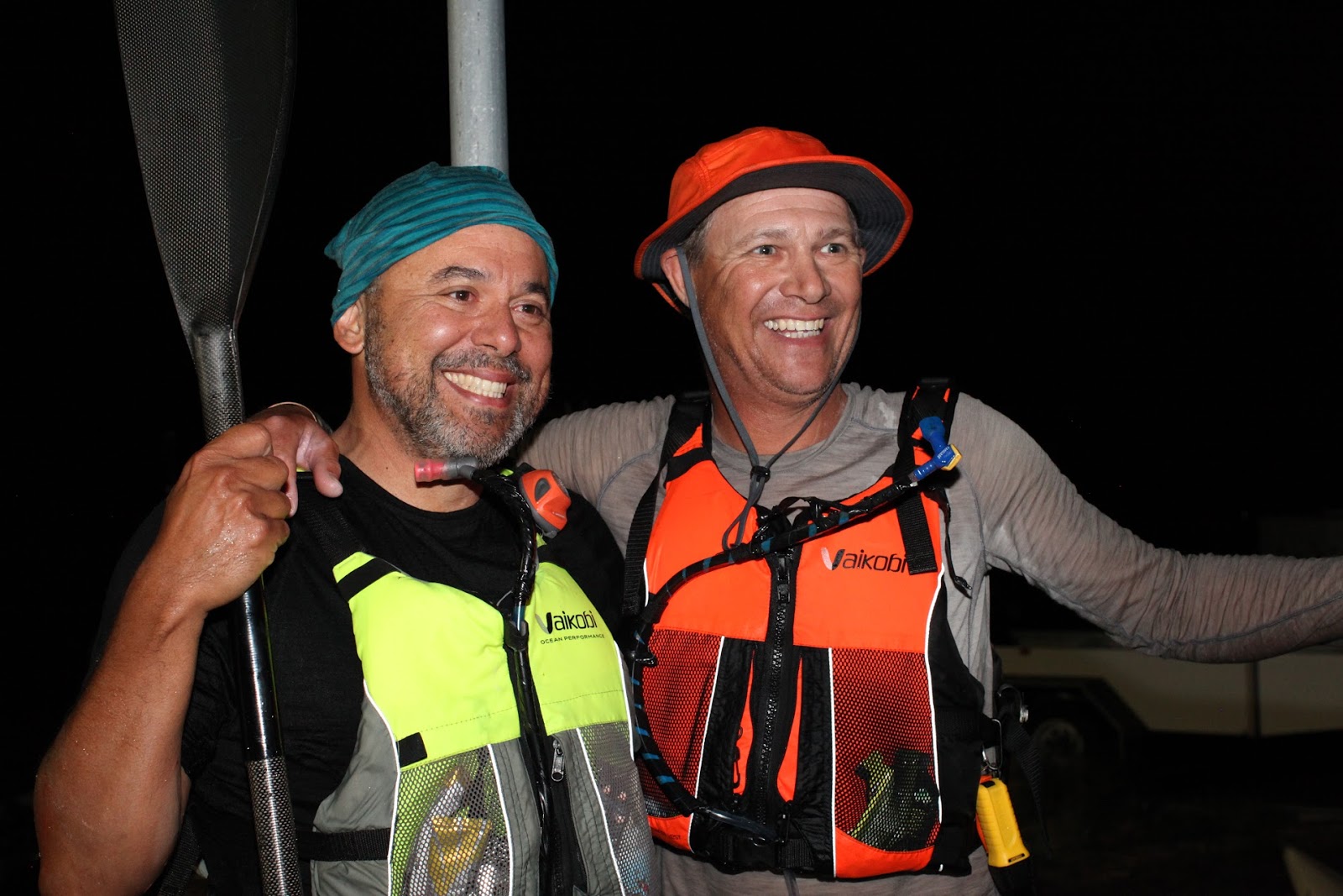 From the gun we got ourselves into a nice rhythm, ticking along with the spray flying forwards over our heads in the wind, and clipping through waves that whilst not shaped up to offer any sort of ride, were still making us feel very cheery. Club-mate Mark hooked in behind us and stayed there until just before the 60km checkpoint at Wiseman’s, where he must have done the quietest capsize in history, because we looked around when we arrived and he wasn’t there. Tucking in behind may have offered him a small ride on our substantial wash, but that would have been offset by having to listen to the pair of us carrying on as we snuck along the river banks in the dark, trying to distract each other from the increasing grind of a building head tide. I reckon we bored him to sleep and he fell in. Our other club-mates Ross & Robyn snuck onto our wash at some point in the dark, & after a few minutes listening to the pair of us Ross started vomiting uncontrollably.